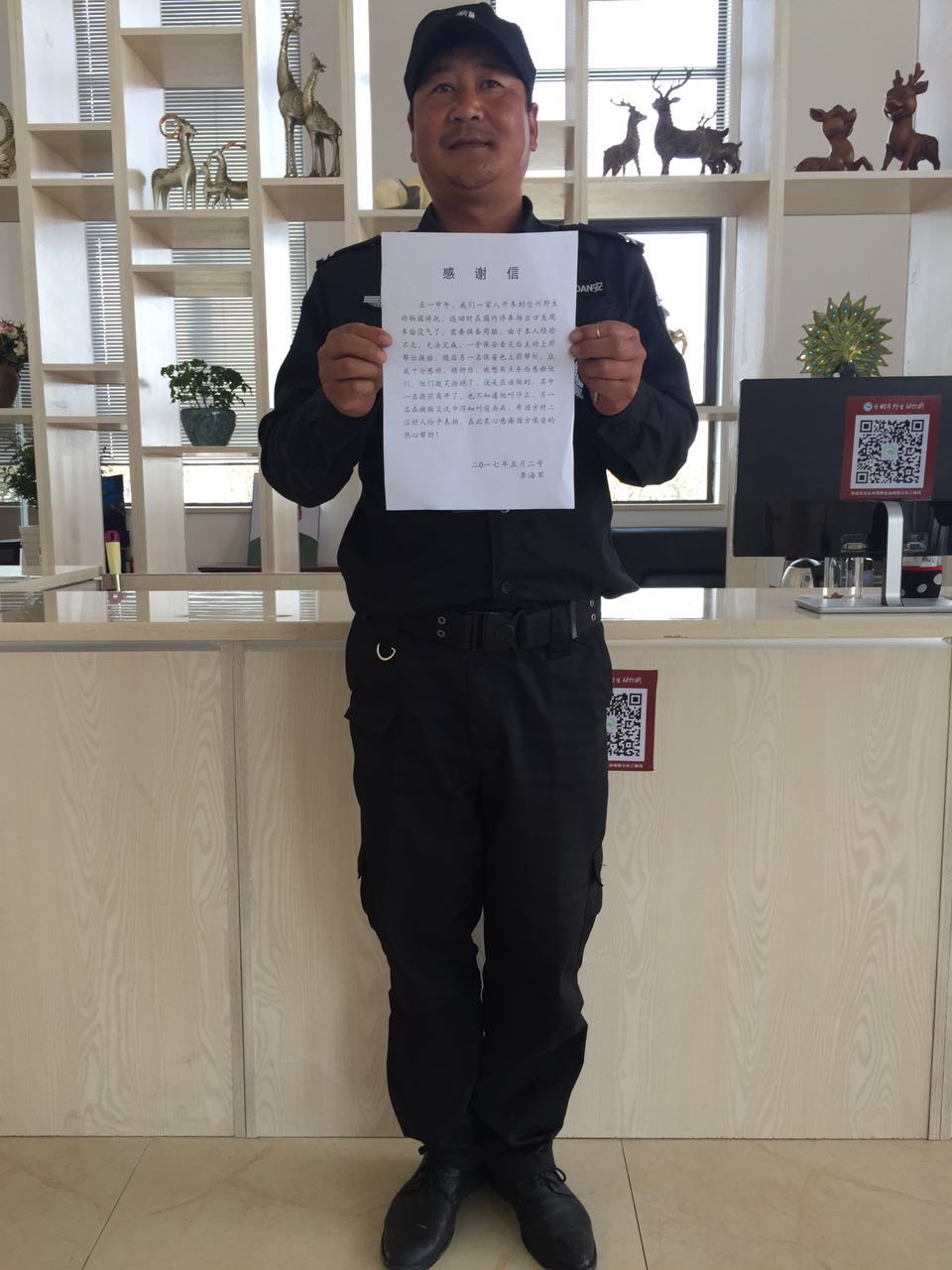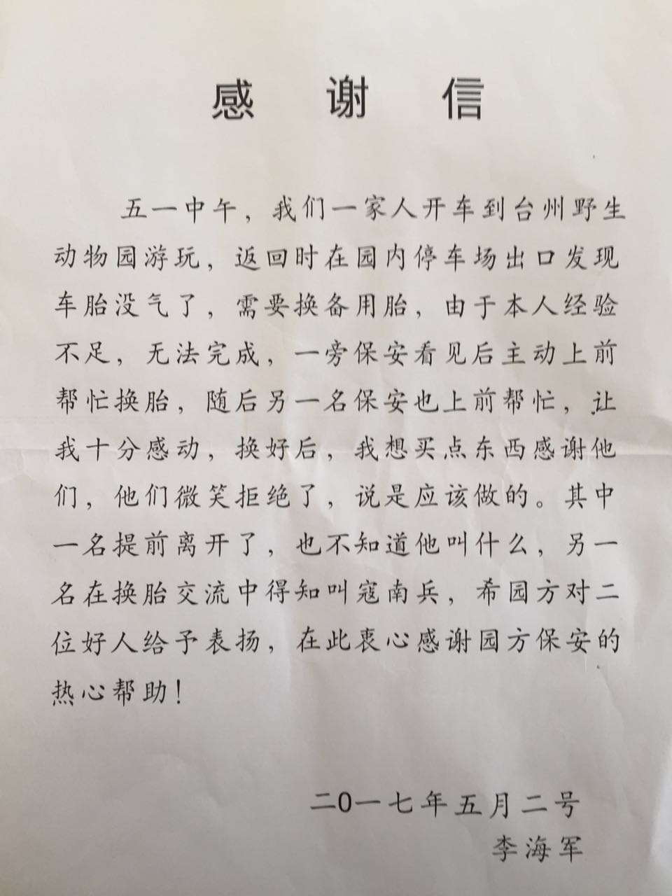五一,正值小長假的最后一天,也是臺(tái)州灣動(dòng)物園開園第三天,當(dāng)天過來游玩的游客達(dá)到近萬人,所有的工作人員都如火如荼的忙碌著。正在這時(shí),一名游客帶著孩子過來游客服務(wù)中心,急沖沖的尋找管理人員,說要表揚(yáng)我們亞太物業(yè)的保安寇南兵。經(jīng)我們對整件事情的了解,原來當(dāng)天中午,李先生一家三口開車到動(dòng)物園游玩,結(jié)束返回停車場時(shí)發(fā)現(xiàn)車胎沒氣了,正在焦頭爛額之時(shí),我們的保安巡邏到此發(fā)現(xiàn)這一情況,二話沒說就主動(dòng)上前幫忙。在多人的齊心協(xié)力下,很快就將備用車胎換上。李先生當(dāng)時(shí)想要買些禮物作為回報(bào),被我們耿直的保安婉拒了。他們一家人為了表示感謝,特此寫了一封感謝信快遞到動(dòng)物園,得到了動(dòng)物園的甲方表揚(yáng)。