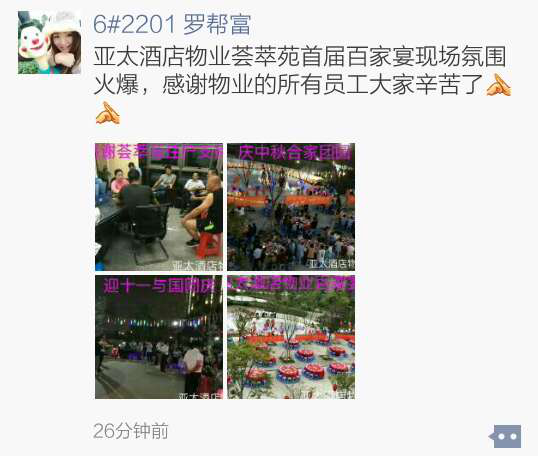 一陣陣的歡聲笑語回蕩在小區(qū)里,歡樂的點滴記在大家的腦海里。尾聲音樂響起,活動即將結(jié)束,住戶們依依不舍?;顒咏Y(jié)束,我們的工作并沒有結(jié)束。場地上還活躍著員工的身影,清潔工作在持續(xù)著。當客服人員在查看微信管家時,還收到住戶的感謝之詞。也看到住戶在朋友圈發(fā)部拍下員工清理場地,并表示感謝后勤人員的默默付出??吹竭@些后,我們猶如得到最好的贊美和禮物,那是滿滿的成就感,一下子再多的辛苦都煙消云散了。