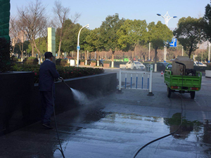 一大早走過廣場,就會聽見高壓水槍嘩嘩的水聲、摩擦路面的清脆聲,此起彼伏著,一段段清爽干凈整潔的廣場路面立刻展露出了它的新顏,同時也引來了商業(yè)廣場業(yè)主,路人的一片贊許聲。