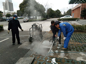 為積極響應(yīng)總公司“科技亞太”的號召,同時針對余姚煙草公司職工食堂廚余垃圾時有堵塞下水管道的現(xiàn)象,2018年元月26日下午,寧波市亞太酒店物業(yè)管理有限公司余姚煙草管理處一改以往“手工掏撈地溝油”的操作法,在項目經(jīng)理褚孟龍的創(chuàng)導下,管理處工程、保安密切配合,從總公司運來了“燃油高溫、高壓清洗機”,利用高溫及高壓水,迅速疏通被油污堵塞的排污管道,開展了一次對由廚房通向地下油污管道的清洗工作。工程、保安人員頭頂鵝毛般的雪花,冒著刺骨的寒風,經(jīng)過二個多小時的艱辛操作,順利完成了對由廚房通向地下油污下水道的清洗工作,寫下了2018年首頁“科技亞太”的新篇章,同時也為余姚煙草公司節(jié)省下了上千余元的管道清洗費用,真正做好了“開源節(jié)流”工作,為業(yè)主余姚市煙草專賣局獻上了2018年度第一份新年賀禮。