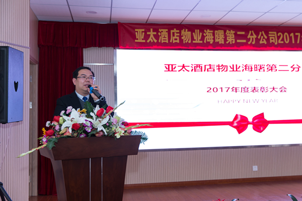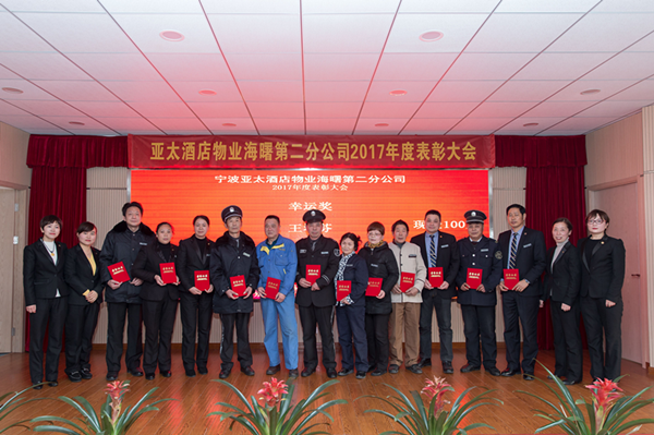 2018年2月1日,海曙二分公司隆重召開了2017年度表彰大會。寧波站區(qū)域綜合黨委書記回娜、亞太酒店物業(yè)二公司總經理葛永亮、副總經理徐亞君以及海曙二分公司總經理章盛臻與全體獲獎員工匯聚一堂?;仡?017,展望2018,共同分享成果、交流經驗,繪制未來。會上,葛總總結了亞太成立以來的心路歷程,展望了未來發(fā)展的規(guī)劃。參會員工備受鼓舞,信心滿滿,并積極互動,踴躍展示才藝。