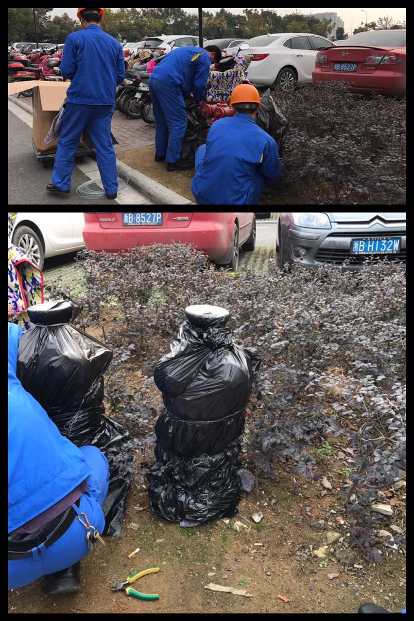 為了預(yù)防溫度過低凍裂水管,物業(yè)的工程師傅采取對(duì)室外地面的消火栓等加裝保溫棉的辦法,用保溫棉保持溫度,預(yù)防水管凍裂。先用保溫棉將水管包起來,套上塑料袋,最后用鐵絲對(duì)保溫棉進(jìn)行固定,完成對(duì)水管的保溫。因水表位于井蓋下,于是對(duì)水表采取用沙子覆蓋,進(jìn)行保溫。